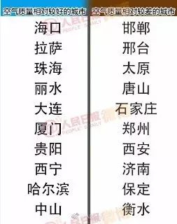 环境保护部发布2017年8月全国城市空气质量状况,后10位城市依次是:邯郸、邢台、太原、唐山、石家庄、郑州、西安、济南、保定和衡水;前10位城市依次是:海口、拉萨、珠海、丽水、大连、厦门、贵阳、西宁、哈尔滨和中山市。