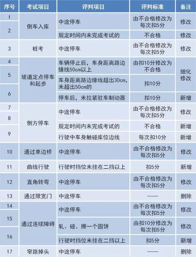此前的标准只是规定了具体的操作规范,但新的标准却明确了完成操作的时间限制。其中倒车入库完成时间不能超过210秒,侧方停车完成时间不能超过90秒,一旦超出时间即判为不合格。但中途停车却由从前的不合格修改为每次扣5分。