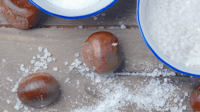 准备炒锅,放入海盐和栗子,