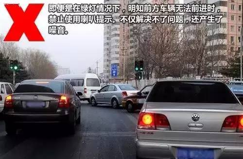在一些比较拥堵的路口,尤其是行人、自行车、机动车混行的情况下,那么很有可能出现绿灯放行,但由于拥堵无法前进,很多司机习惯性的使用喇叭提示前方车辆,而且是长时间的鸣笛。如果出现这种情况,我们建议驾驶员先观察一下情况,如果确实是路道畅通而前方车辆没有启动,那么可以选择使用灯光进行提示,但依旧没有效果的情况下,使用鸣一次喇叭提示对方即可。
