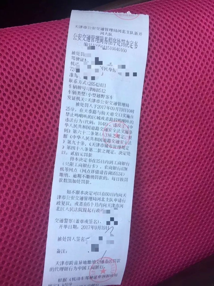 交警开的处罚单上写着:被处罚人于2017年9月19日10时25分,在天泰路与榆关道交口实施在禁止鸣喇叭的区域或者路段鸣喇叭的违法行为(代码:1048)。违反了《中华人民共和国道路交通安全法实施条例》第六十二条第(八)项之规定,根据《中华人民共和国道路交通安全法》第九十条,《天津市城市管理规定》第四十八条第二款之规定,决定处以:二百元罚款。