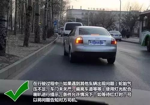 ●4.提示道路上出现问题车辆轮胎气压不足、严重跑偏、车门未关严等等)时,建议先使用灯光对其进行提示,如果无效果再对其进行喇叭提示,最好在停止状态下告知对方车辆。