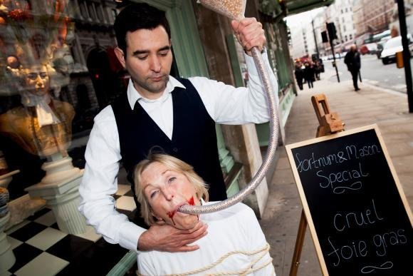 其实鹅肝酱在法国同样是争议性食物,因为在制作过程中会对鹅催肥,有人形象地说“这等于认为让鹅患上脂肪肝”。《世界报》评论称,PETA在这个问题上还算闹得有点理由。要知道这个组织为弄垮加拿大鹅牌羽绒服不但堵店、闹场,还憋出买1股股票然后去股东大会上闹的损招,至于为了不让顾客在餐厅吃鸡大闹餐厅的手段,就更是不知所云了——要知道PETA的宗旨,可是让全世界人们都不去吃肉的,唉,也不知同为生物的青菜哪儿得罪他们了。