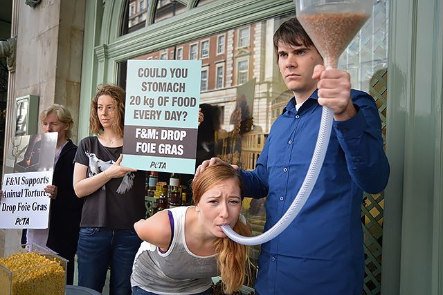 之所以这么折腾,是因为加州是北美狂热动物保护人士扎堆的地方,有个名叫“善待动物组织”(PETA)的团体,在其领导人古德曼倡导下,以制作鹅肝酱“令鹅感到身体不舒适”为由,十几年如一日地进行“堵店”、“街头活报剧”和法律诉讼,力图从根本上摧毁加州鹅肝酱产业。