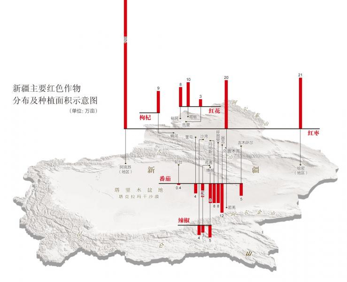 现在,“红”的内容更加丰富,吸纳了枸杞、辣椒、大枣、红花、石榴等作物,产品加工也向多元化、精细化、集约化发展。也正是基于多元化、精细化和集约化的新型发展战略,这诱人的“红”浸润了天山南北,红遍了世界各地。