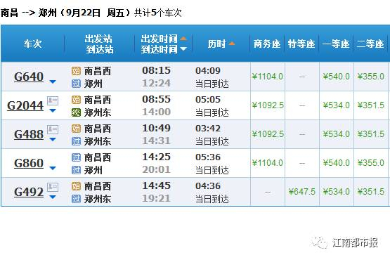 南昌将开通G2044次南昌至郑州的直达高铁,全程需5小时,但是武九高铁开通的G字头动车上,速度最快的还是G488次,南昌到郑州只需3小时42分,二等座票价为351.5元。