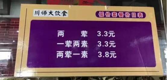 川师大食堂价格至今已经十余年没变。两荤菜3.3元,一荤两素3.3元,两荤一素3.8元,简直是业界良心、高校食堂界的楷模。不仅价格便宜,还根据男生和女生的不同饭量分开来计算。一份盖浇饭,男生4.6元,女生只要4.4元。从2002年起就定下了这样的套餐价格,这么多年从来没变过,如果有亏损就由学校补贴。