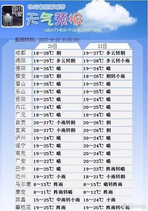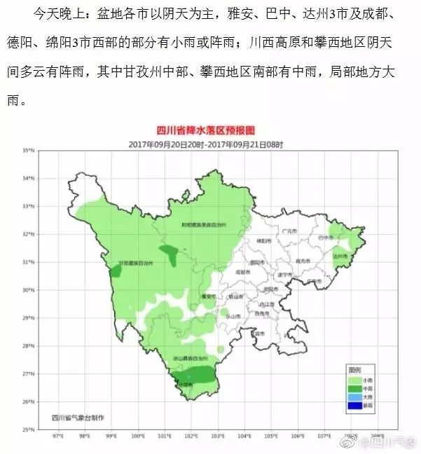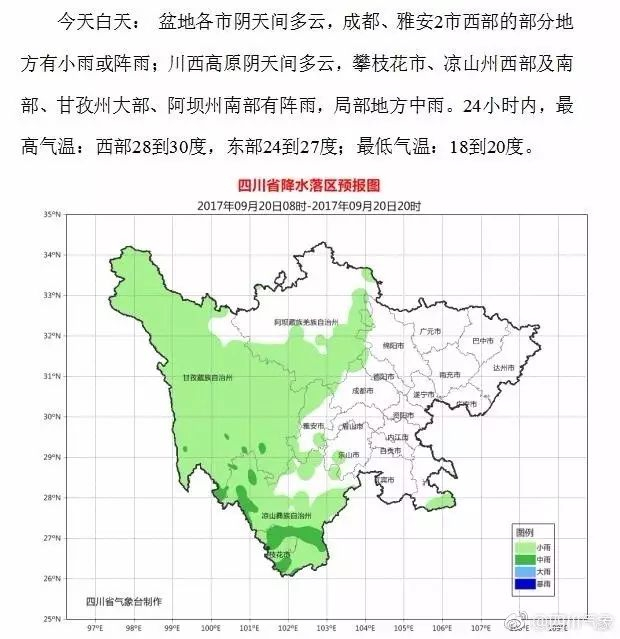 今天白天到晚上: 盆地各市阴天有短时多云,雅安、巴中、达州3市及成都、德阳、绵阳3市西部的部分地方早晚有小雨或阵雨;川西高原和攀西地区阴天间多云有阵雨,其中甘孜州中部、攀西地区西部及南部有中雨,局部地方大雨到暴雨。24小时内,最高气温:西部28到30度,东部24到27度;最低气温:18到20度。