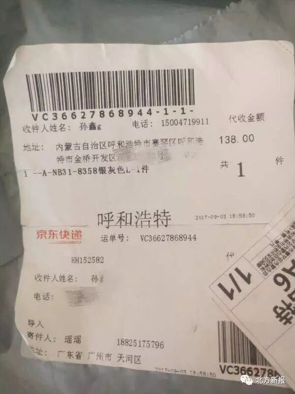 9月14日,记者与给孙女士送货的京东快递员取得联系时,快递员让记者找京东呼和浩特市金桥开发区黑河站的段站长。