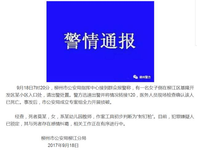 9月18日,柳州市警方通报,该市柳江区18日早上发生一起命案,一名幼儿园女教师遇害。