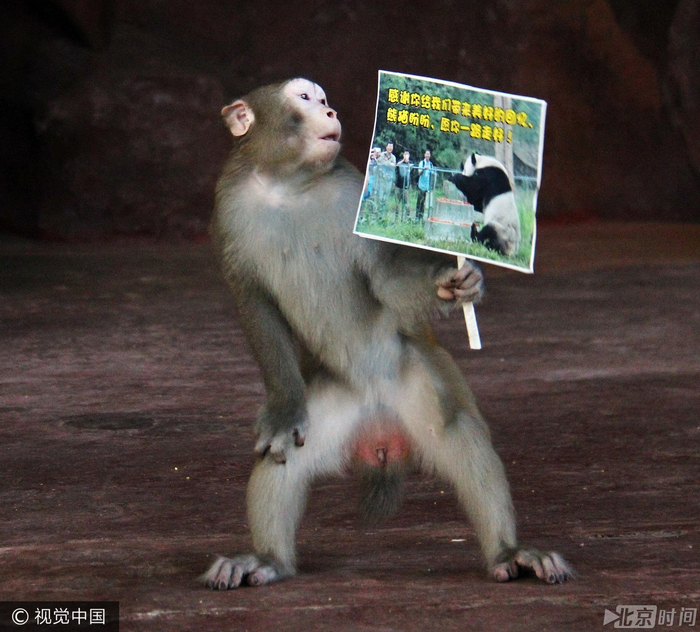 它的好兄弟猴子演出时手举着牌子,摆着姿势告诉观众,他的好兄弟去世了,心里十分难过。牌子上面有盼盼生日的照片以及写着一些想念盼盼的语句。一起默哀的还有金刚鹦鹉,葵花鹦鹉等。