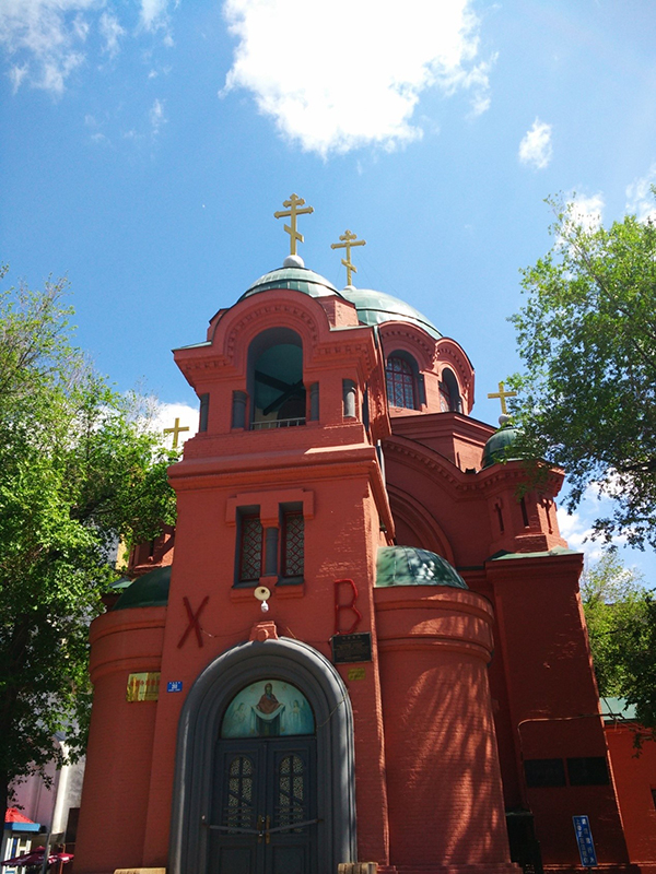 在果戈里大街上,走过士课街,远远能看到一座雄伟的红色教堂,这座教堂当年是一座东正教堂,叫做圣阿列克谢耶夫教堂,也叫圣母无染教堂,如今却成了一座天主教堂。