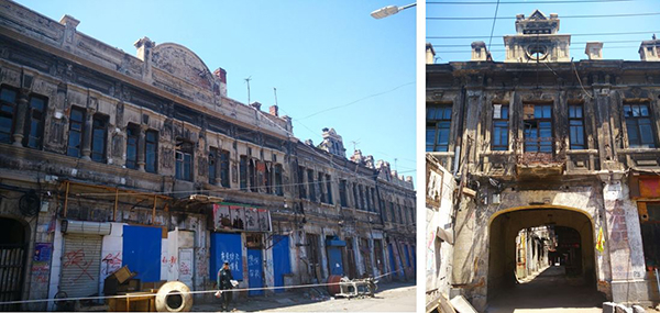 这片街区原本与中华巴洛克步行街连在一起,但政府没有足够的改造资金,街区因此荒废。这些百年前的老房子,几乎每栋都是危房。这里的店铺和住户,大部分都已搬走,其中包括很多哈尔滨老字号的餐馆和点心铺,从老照片上才能看出这里曾是多么繁荣的商业街区。