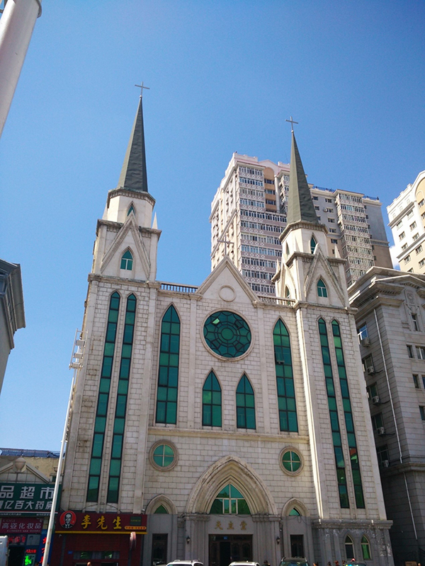 马路对面的一栋白色建筑高耸入云,是天主教的耶稣圣心主教座堂。最早是波兰侨民们修建的天主教堂,当年随着中东铁路而来的波兰人超过三千人,大多居住在这条街附近,在此修建了自己的教堂和学校,有着繁荣的活动社区。可惜相关建筑基本已被拆毁。如今这座耶稣圣心教堂是黑龙江最大的天主教堂,但与原样也完全不同了。