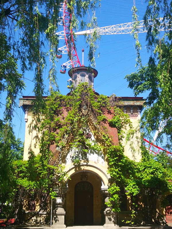 穿过游乐设施,走进文化公园深处,可以看到一座被绿色植被覆盖的欧式建筑,乍一看以为是游乐场的一部分,如同一座主题公园城堡。这是当年公墓仅剩的遗留——圣母安息教堂及钟楼。这座教堂的洋葱头穹顶早已不见,墙皮也出现脱落,有一块告示牌提示游客危险勿近。只有一些老建筑爱好者,专门来探访这座当年著名的公墓教堂,而教堂内是不能进入的。