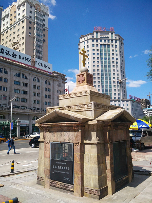 南岗区东大直街是哈尔滨曾经最繁荣的商业街,上面有著名的秋林公司,1908年开设至今,都在销售俄国食品。东大直街有目前哈尔滨唯一一座日常开放的东正教堂——圣母守护教堂。从远处可以看到东正教堂标志性的洋葱顶,教堂墙面通体暗红,墙上有拱形的窗子,穹顶深绿,顶上是金色的斜十字架,格外庄严肃穆。每周这里有宗教活动。