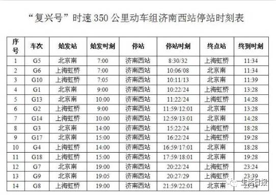 20日下午,济南铁路局相关负责人介绍,新图实施后,京沪高铁北京南至上海虹桥间将有7对“复兴号”动车组列车,按时速350公里运行,济南西站成为山东境内唯一停靠站点,其中G1、G2、G3、G4以及G8次列车,为首次停靠济南西站。最早一趟“复兴号”动车组停靠济南西站时间为8:30分,是由北京南站7:00分始发的G5次列车;最晚一趟“复兴号”动车组停靠济南西站时间为21:59分,是由上海虹桥开往北京南的G8次列车。