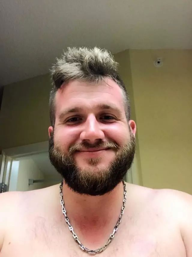 剃光了头发,但是留着胡子,腿部可能有鱼形纹身。