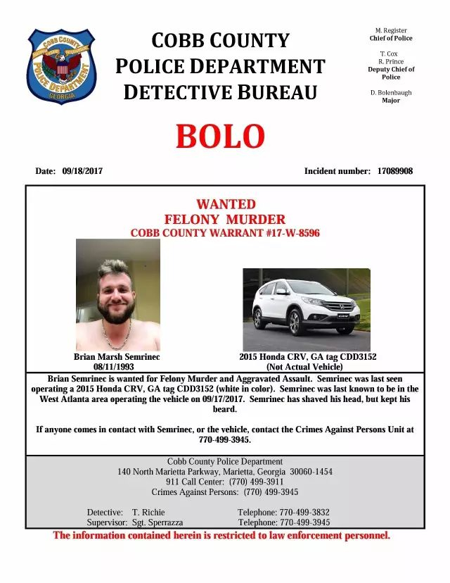 警方在警告中显示,现年24岁的森里内克是这起凶杀案的嫌犯,他的汽车还停在车库内,而受害人曾驾驶的白色2015年Honda-CRV,车牌号码佐治亚州CDD3152却被他开走,目前嫌犯在逃。