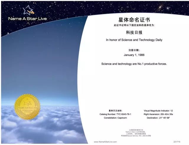 这家网站还贴心地提供中文名字选项。大概几秒钟后,记者就得到了一张带有注册日期、星体天文坐标的证书。