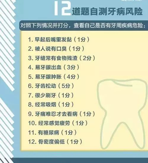 口腔健康的标准是“牙齿清洁、无龋洞、无疼痛感、牙龈颜色正常、无出血现象”。你是否感觉自己牙齿健康呢,下面12道题可以测出你是否有牙病危险。