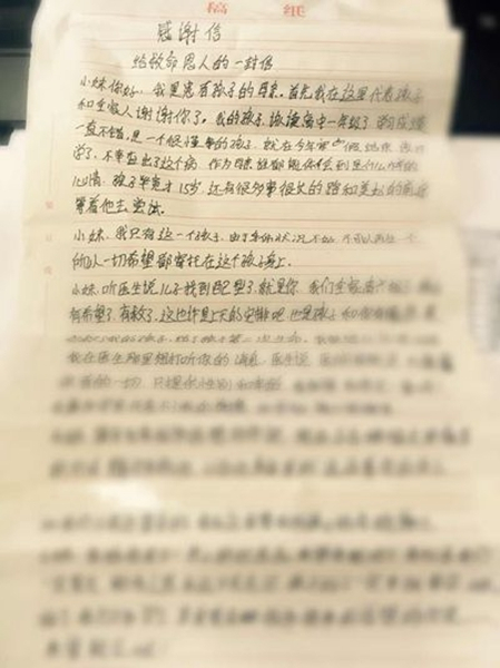 小妹,听医生说儿子找到配型了,就是你。我们全家高兴极了。孩子有希望了,有救了。这也许是上天的安排吧,也是孩子和你有缘分。是你救了我的孩子,给了孩子第二次生命,我很想认识你小妹。我在医生那想打听你的消息,医生说,医院有规定,不透露供者的一切。只提供性别和年龄……