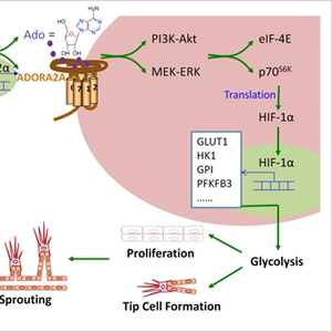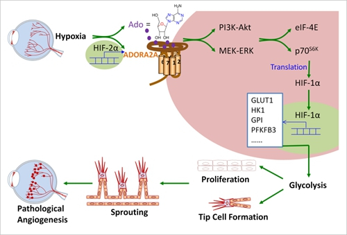 腺苷是一种独特的细胞代谢调节物,能够影响细胞多种生理过程从而调节机体不同组织器官的生理功能。细胞外腺苷对不同细胞生理过程的调节作用主要是通过分布在细胞膜上的腺苷受体(Adenosine receptors, ARs)介导的。ARs属G蛋白偶联受体,包括四种亚型:ADORA1、ADORA2A、ADORA2B和ADORA3。有研究人员对I型糖尿病病人进行长达20年的跟踪研究发现,ADORA2A基因变异(SNP rs2236624和SNP rs4822489)与PDR的发病率呈显著的相关性。本研究中,霍玉庆/洪梅课题组通过对NIH数据库的临床资料分析发现I型糖尿病病人的ADORA2A基因当有与高糖尿病视网膜病变的SNPs发生时,其ADORA2A mRNA表达上调(rs2236624, P=0.08; 和rs4822489, P<0.01);体外研究发现,当人视网膜微血管内皮细胞暴露于缺氧环境下,ADORA2A表达显著上调,而其它三种ARs的表达水平则无明显改变,提示视网膜组织缺血缺氧环境下内皮细胞腺苷-ADORA2A信号的过度激活可能是PR发生发展的关键因素。他们进一步的机制研究揭示了活化的G蛋白偶联受体ADORA2A启动下游ERK1/2及Akt激酶磷酸化激活,并进一步活化下游蛋白翻译起始因子p70S6K和eIF-4E,促进HIF1α蛋白合成而介导糖酵解基因的转录,从而增强内皮细胞的糖酵解代谢功能,进而引发内皮细胞增殖、出芽、顶端细胞以及官腔形成,最终导致视网膜病理性血管生成(见图)。