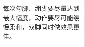 具体方法:双膝自然伸展,用尽全力勾脚10秒钟后再用尽全力绷脚,反复进行,在不引起疼痛的前提下不限次数,越多越好。
