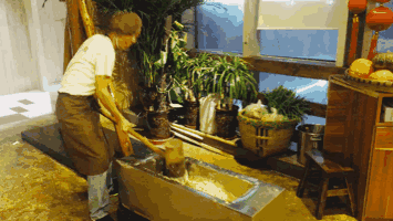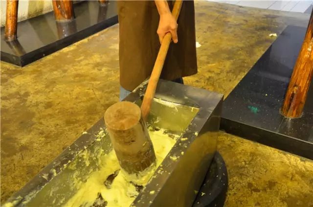 搅团:师傅大力锤砸,最终砸出一碗碗软糯劲道的美味。浇上调味汁和咸韭菜,用筷子慢慢夹起入嘴,窜出的汤汁和韭菜香就能打开全部胃口;