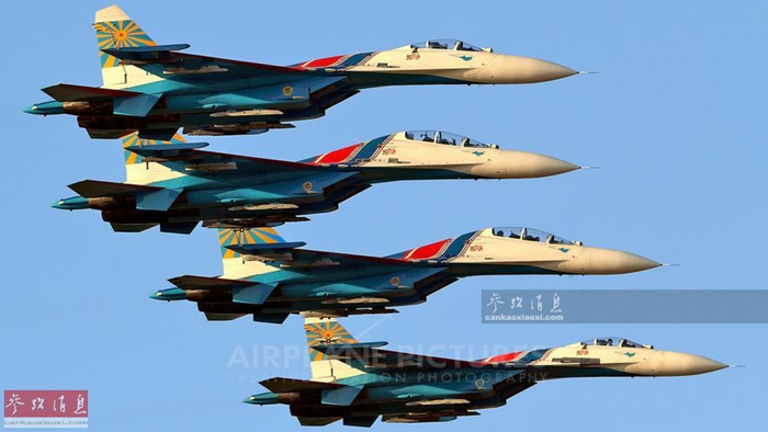 俄罗斯勇士队苏-27战机表演密集编队。
