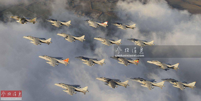 英空军“鹞”式短垂战机告别飞行时的大密集编队。
