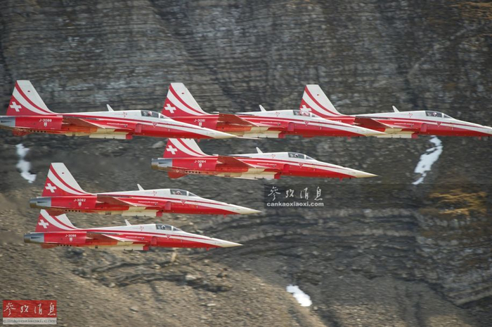 “瑞士巡逻兵”表演队F-5战机以密集编队在峡谷中低空飞行。