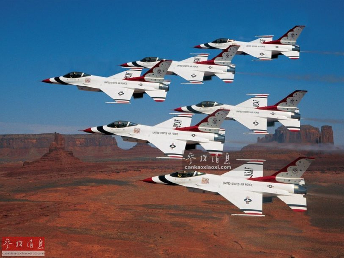 美空军“雷鸟”飞行表演队F-16战机进行密集编队表演。