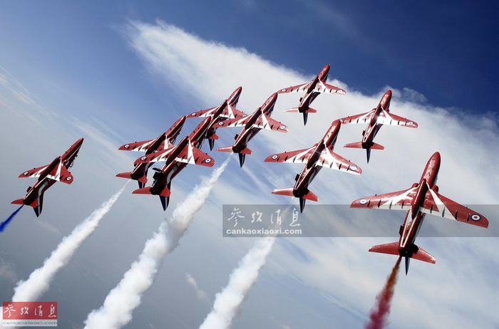 英国“红箭”表演队“霍克”教练机密集编队飞行表演。