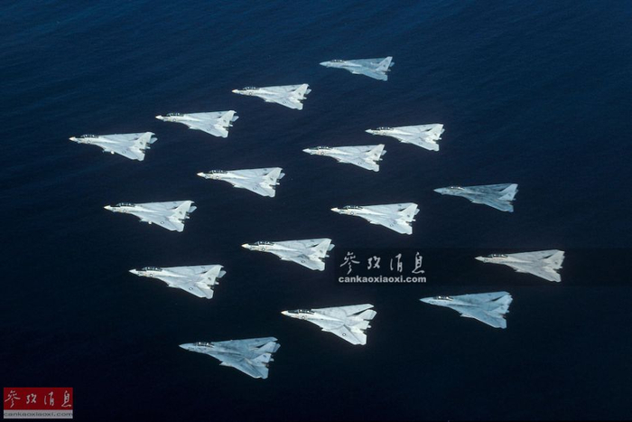 美海军F-14重型舰载战机密集编队。