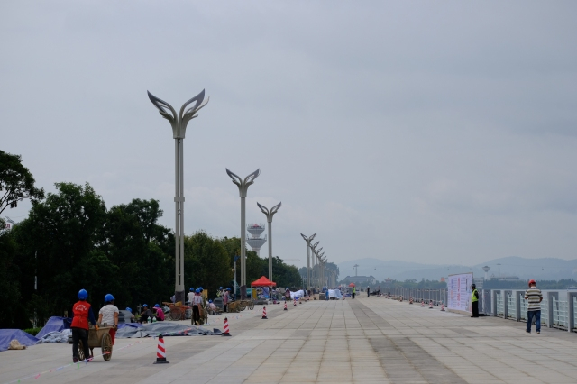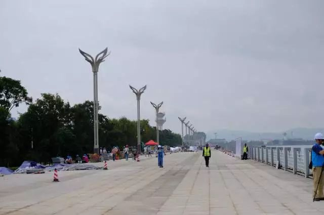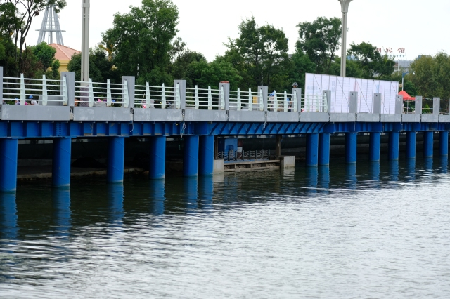 从现场情况来看,平台拓宽后,由两排整齐插入水中的巨大的蓝色钢管桩托起,新建的白色栏杆也增加了通透性,而平台两侧也建起了两排浅灰色的、高高的华灯。
