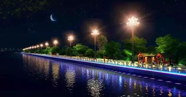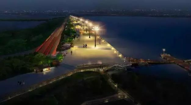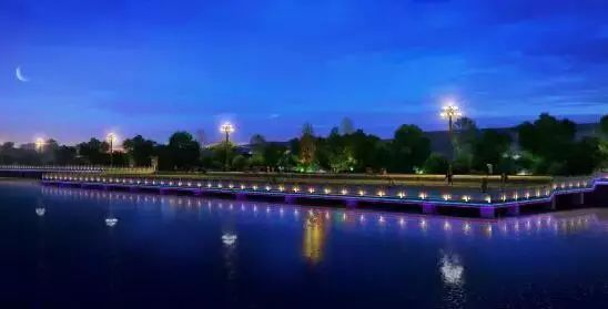 全长2.4公里的坝梯护栏和亲水台设置一条灯带,打造华丽夜景。