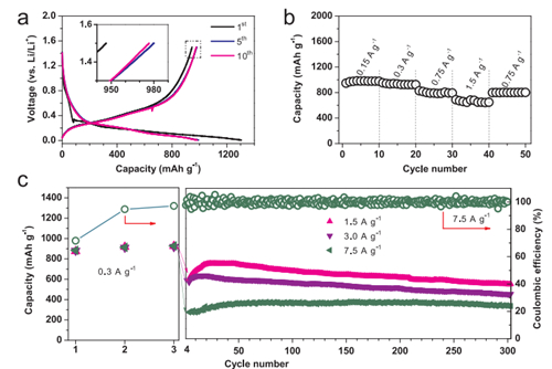 中国科学院宁波材料技术与工程研究所动力锂电池工程实验室自2011年开展硅基负极材料的研究开发,已取得系列进展。2012年报道了一种三维多孔的纳米硅/石墨烯复合负极材料。近日,又报道了一种新型二维纳米硅/二氧化硅复合负极材料(2D nano-Si/SiO2)。该工作利用层状结构CaSi2的拓扑转变,在酸性溶液中化学剥离Ca原子(图1a),留下单原子层褶皱状硅烯,由于Si原子只存在sp3杂化,硅烯极不稳定,在水溶液中氧化得到亚稳态二维硅氧烯(图1b),二维硅氧烯经过合适的热处理条件脱水歧化得到二维纳米硅/二氧化硅复合负极材料(2D nano-Si/SiO2),其中纳米硅均匀分散于无定型硅氧化物(图1c)。二维结构可有效减少锂离子迁移路程,纳米硅和硅氧化物可有效降低了体积膨胀率,因此采用该方法制备的2D nano-Si/SiO2@C表现出优异的循环稳定性和倍率性能。电化学性能测试表明,在0.15A/g条件下,首次放电容量大于950mAh/g,在7.5A/g的大电流密度下,放电容量达360mAh/g,相比于文献已报道的硅或硅氧化物材料,倍率性能具有显著优势(图2);在1.5,3.0和7.5A/g的大电流密度下,循环300周容量保持率分别为73%,73%和92%(图3)。该新型2D nano-Si/SiO2@C负极材料,有望应用于长续航电动汽车(图4)。