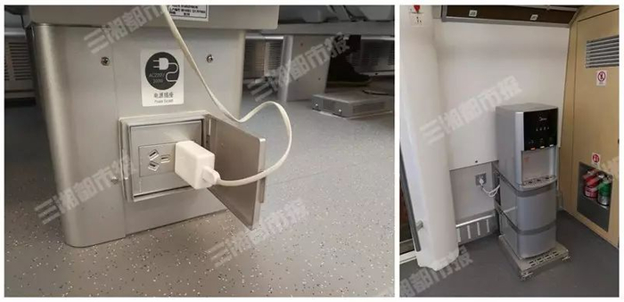 列车上的电源插座(左)和饮水机(右)。记者 潘显璇 摄