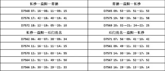 长沙站至益阳站、常德站、石门县北站每日最早动车为D7562次,6时40分从长沙站出发,7时38分抵达益阳站,8时43分抵达常德站,9时34分抵达石门县北站。每日最晚动车为D7566次,19时30分从长沙站出发,20时29分抵达益阳站,21时33分抵达常德站,22时33分抵达石门县北站。