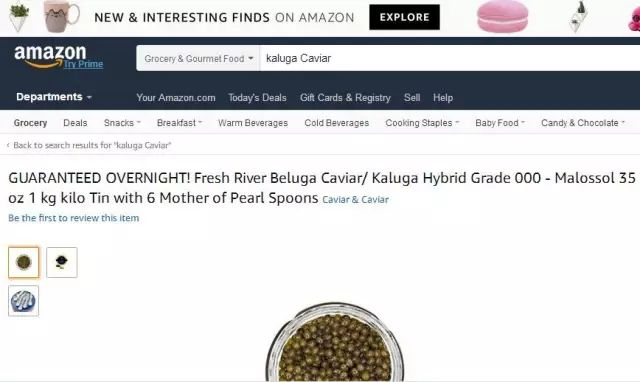 在亚马逊官网找到了该中国品牌旗下的大白鲟鱼子酱(Beluga Caviar)。据了解,大白鲟鱼子酱属于顶级黑鱼子酱的一种。