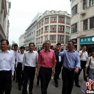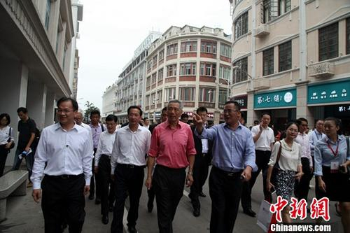 9月21日,新加坡总理李显龙(左三)在福建省副省长李德金(左二)陪同下,参观厦门繁华商业步行街——中山路。中新社记者 杨伏山 摄