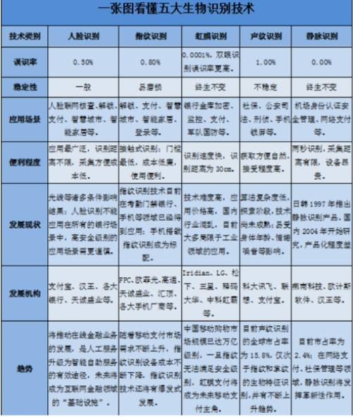 据手机报在线,生物识别主要分为人脸识别、指纹识别、虹膜识别、声纹识别以及静脉识别。