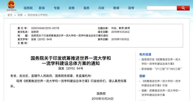 据新华社报道,2015年8月,中央全面深化改革领导小组第15次会议审议通过《统筹推进世界一流大学和一流学科建设总体方案》,11月,国务院正式印发,对新时期高等教育重点建设做出新部署,将“985工程”、“211工程”、“优势学科创新平台”、“特色重点学科建设”等重点建设项目,统一纳入世界一流大学和一流学科建设。