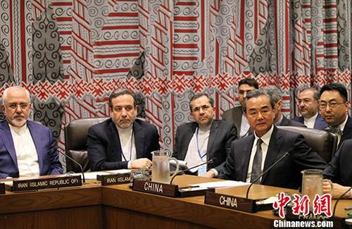 中新社联合国9月20日电 (记者 马德林)中国外交部长王毅20日在纽约联合国总部出席六国与伊朗外长会议。
