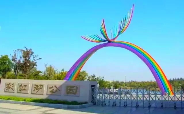 彩虹湖公园位于历城区春晖路,园区内种植有珍贵树种如大型乔木榔榆、柿子树、雪松、银杏等。花灌木有丁香、海棠、紫荆等,绿化覆盖率膏。从西大门进入公园,但觉视野陡然开阔,心胸豁然开朗,一池荡漾的碧波宛若一条墨绿色的玉带,又如一串闪耀的珍珠项链环绕着这片工业新区。