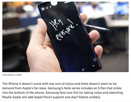 CNBC表示, “iPhone X并没有配备任何形态的手写笔,并且看起来苹果的粉丝们对手写笔并没有需求。三星的Note系列标配一只可以滑进手机底部的S Pen,三星的粉丝喜欢用它去做笔记和画图”。