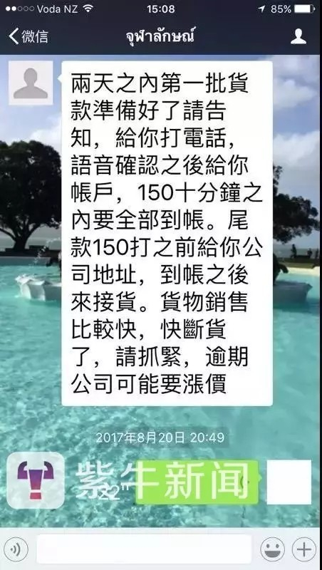 第二天,正在一家人开始为老骆担心之时,他们却收到了泰文名字的微信消息,说骆先生已经被限制了人身自由。“第一次是拨了语音电话给我母亲,里面放了一段电子合成音,自称泰国皇家警 察,说你父亲因为涉嫌携带毒品进入泰国被抓,但是此事可以私了,需要人民币300万,我母亲很害怕就把电话挂了。”紫牛新闻记者在骆先生出示的聊天记录中看到,对方不断提出要求,并写道“人民币300或美金45或纽西兰币60”“语音验收后会告诉你中国账户,5万一次实时入账,首付款到账后请告知尾款交付时间,会通知您收货地点”