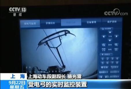 上海动车段副段长 骆光雷:我们复兴号列车是全程实时监控的,这个就是随车机械师的监控室,上面的图像就是受电弓的实时监控,下面的图像是整个运行安全保障的一些界面的监控情况。