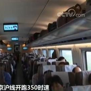 记者:列车从车站开出大约十分钟,复兴号的运行时速就达到了350公里。此刻在车厢里我们感觉运行非常平稳,当然旅客最大的感受还是一进来车厢里的环境空间要比以往大很多。我们了解到,复兴号的身高是4.05米,比和谐号的3.7米大概高出了将近一个行李箱的高度,同时整个车体的宽度也宽出了10公分。别看他空间大了,但是因为整车集中了大量的新技术,所以车辆运行时的阻力和噪音明显地下降了。